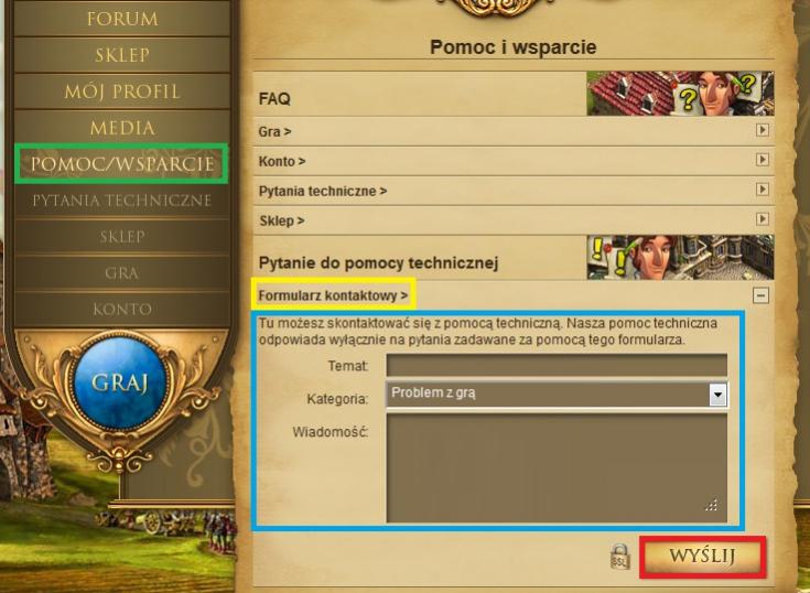 Formularz kontaktowy znajduje się na stronie głównej gry. Po zalogowaniu się na swoje konto, z menu po lewej stronie wybierz "POMOC/WSPARCIE" (oznaczone na zielono).