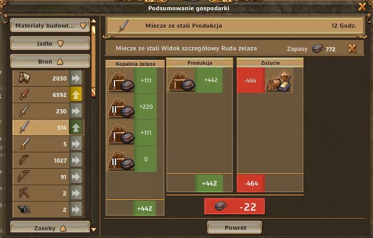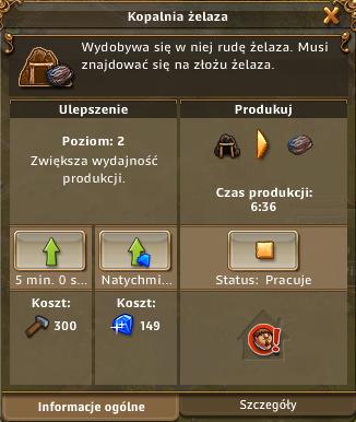 Tak wygląda kopalnia po ulepszeniu. Dostarcza surowce, zmniejsza ilość rudy w złożu, nie ma nad nią wykrzyknika. Mylna jest informacja o tym że nie działa. Nie ma szczegółowej informacji o końcu cyklu. Na podsumowaniu gospodarki to ta kopalnia która ma wydobycie zero.