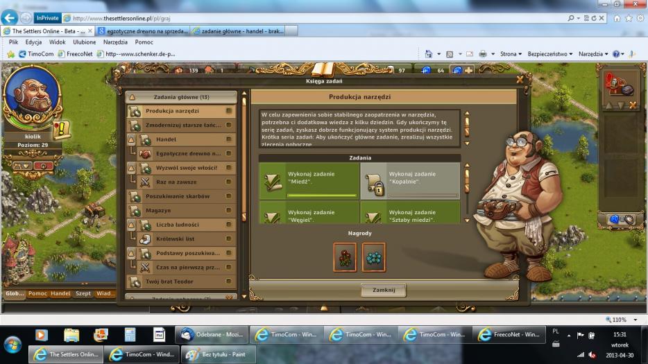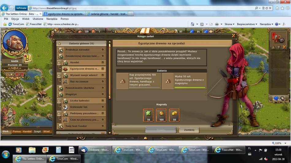 Zadanie "Egzotyczne drewno na sprzedaż" - wykonaj pierwsze polecenie, tzn kup 100 szt drewna egzotycznego, wtedy odblokuje się przycisk Zasoby w celu udostępnienia 50 szt drewna.