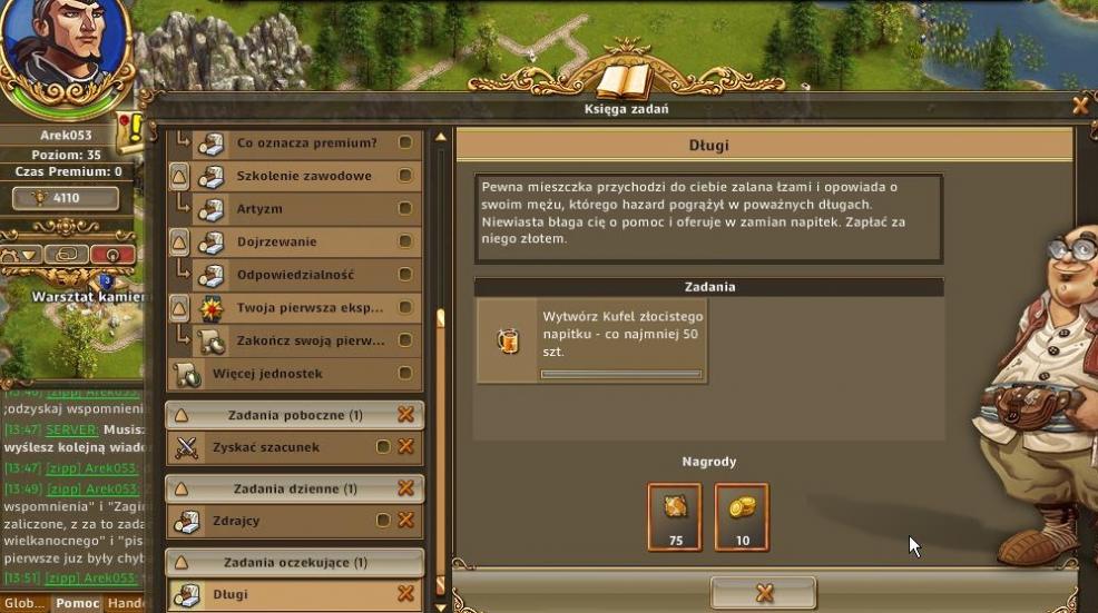 Nie zaliczyło zadania "długi" tak samo jak wczoraj nie zaliczało mi tego zadania co trzeba było wytworzyć koszyki cioci Irmy i za to można było otrzymać 260 drzewa egzotycznego