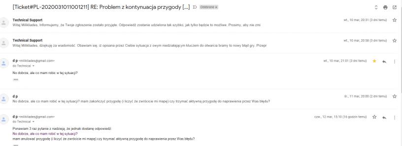 zgłosiłem do supportu informacje o problemie w przygodzie "u stop gór" (przed ogłoszeniem notki o problemie, więc zakładam, że także moja informacja była przyczyną powstania notki). Dostałem informację, że dziękują i proszą o cierpliwość. Zadałem więc pytanie czy mam anulować przygodę czy cierpliwie czekać z aktywną przygodą do naprawienia błędu. Niestety od 3 dni nikt mi nie odpowiedział. Na screenie dowód na podejście do gracza