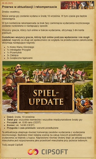 W środę, 10 września, zostanie udostępniona nowa wersja gry. Podczas wdrażania aktualizacji gra będzie niedostępna.